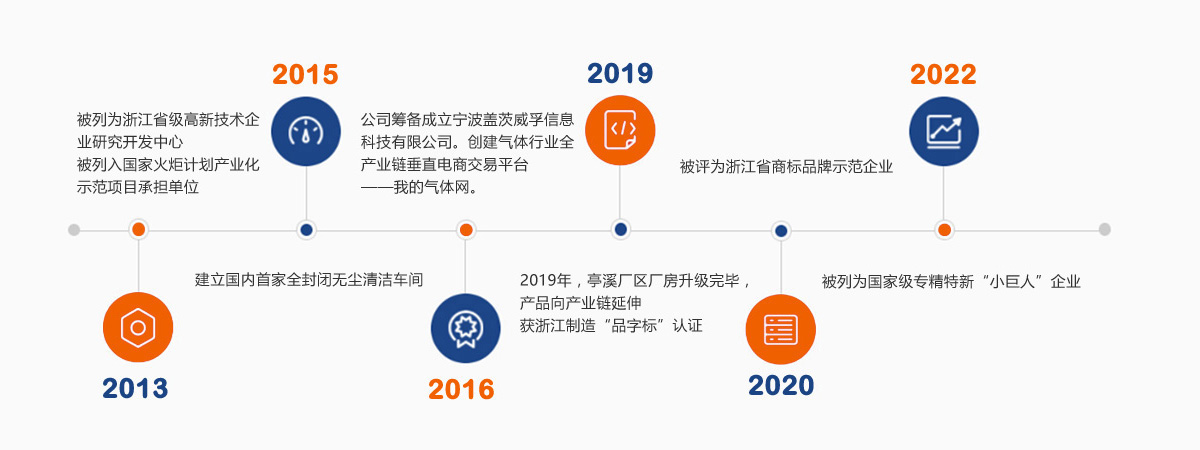 2016:公司籌(chóu)備成立(lì)寧波蓋茨威孚信(xìn)息科技有(yǒu)限(xiàn)公司。創建氣體(tǐ)行業全產業鏈(liàn)垂直電商交易平台——我的氣體網。